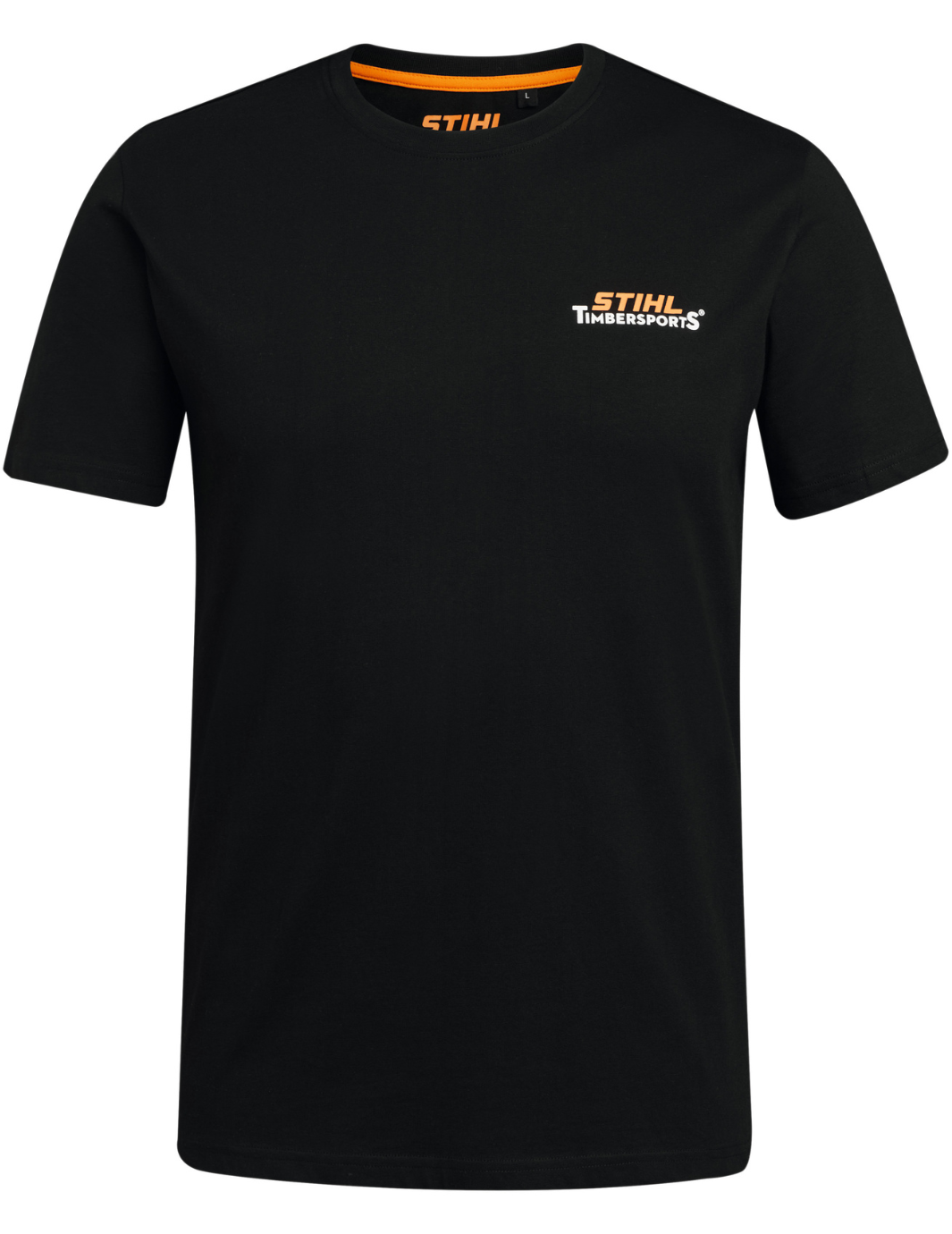 Coloris noir, 100 % coton, col rond avec liséré, inscription „STIHL TIMBERSPORTS®“ en guise d’imprimé avant.